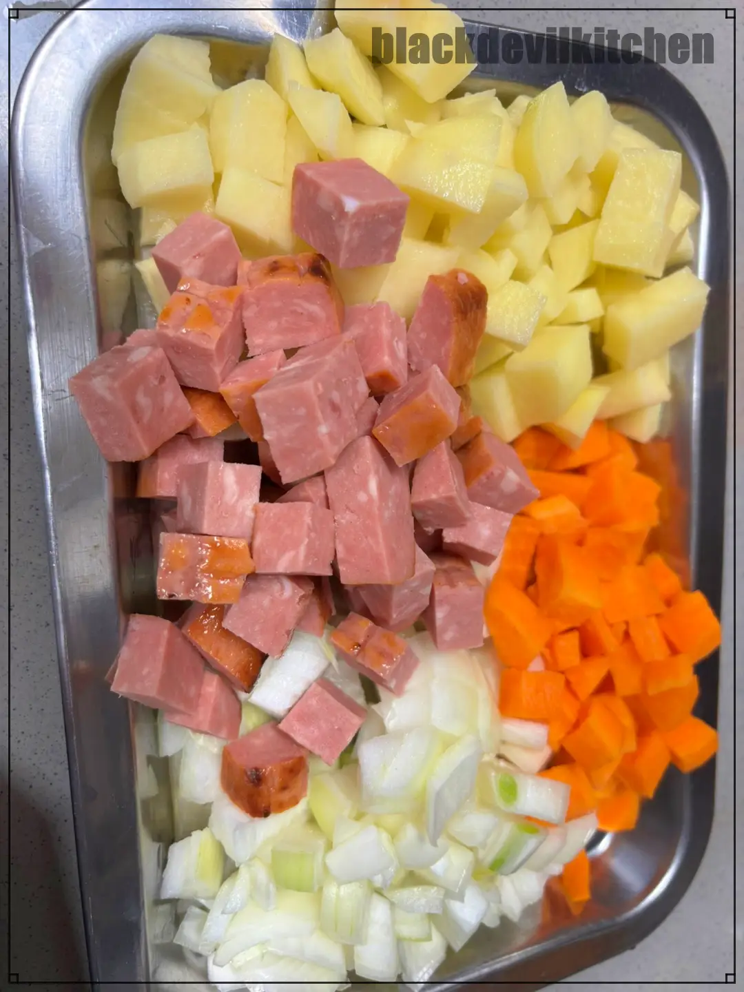 재료는 진심 간단하다. 집에 있는 각종야채 그리고 소시지 아님 햄 아님 고기. 뭐라도 좋다